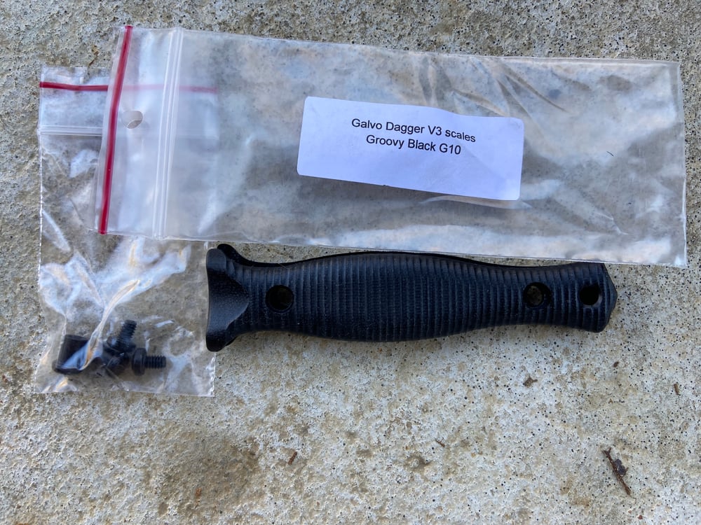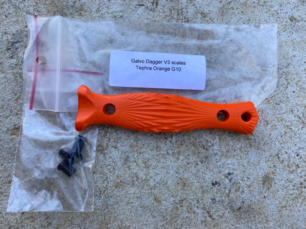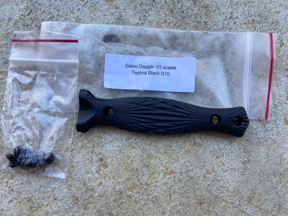 3d machined g10 scales to fit any* of the Galvo daggers. Comes with mounting hardware you only need a Galvo and a T20 torx driver.