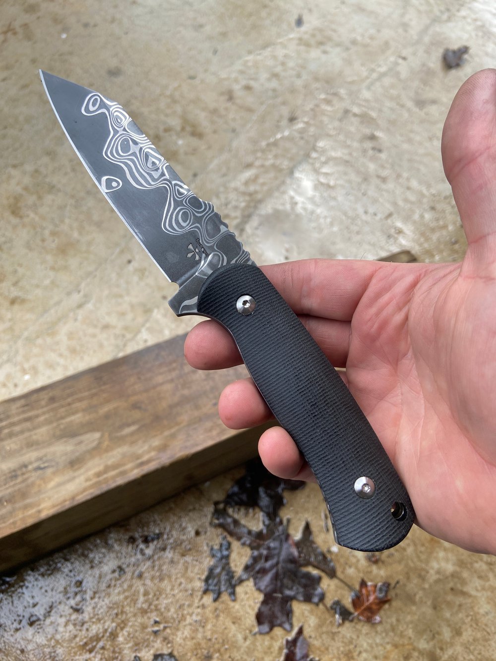This knife is a prototype that I hope to see go into production soon. Stainless Damascus blade, XHP core. Machined micarta handles and a Ken Brock kydex sheath round this one out.