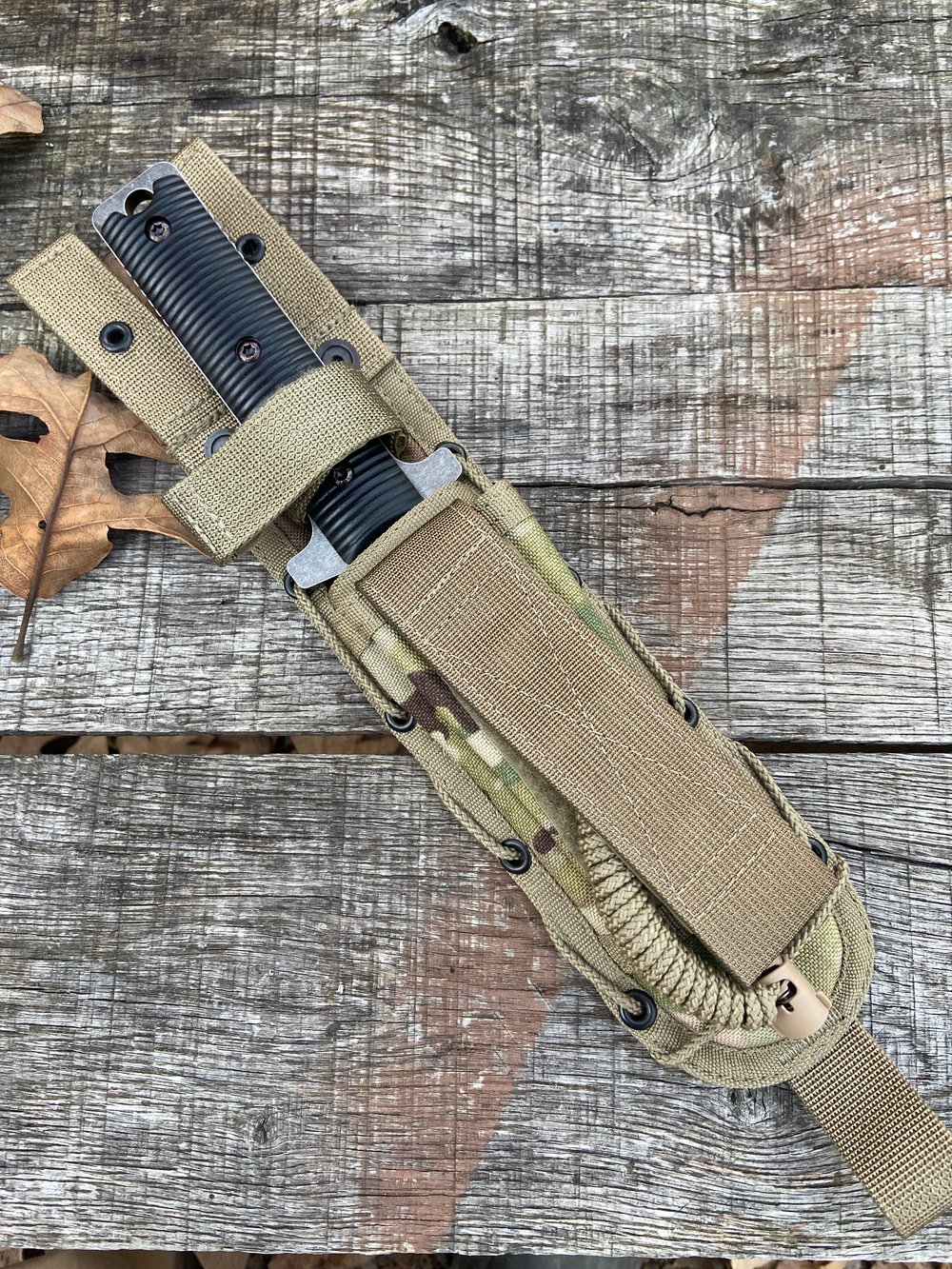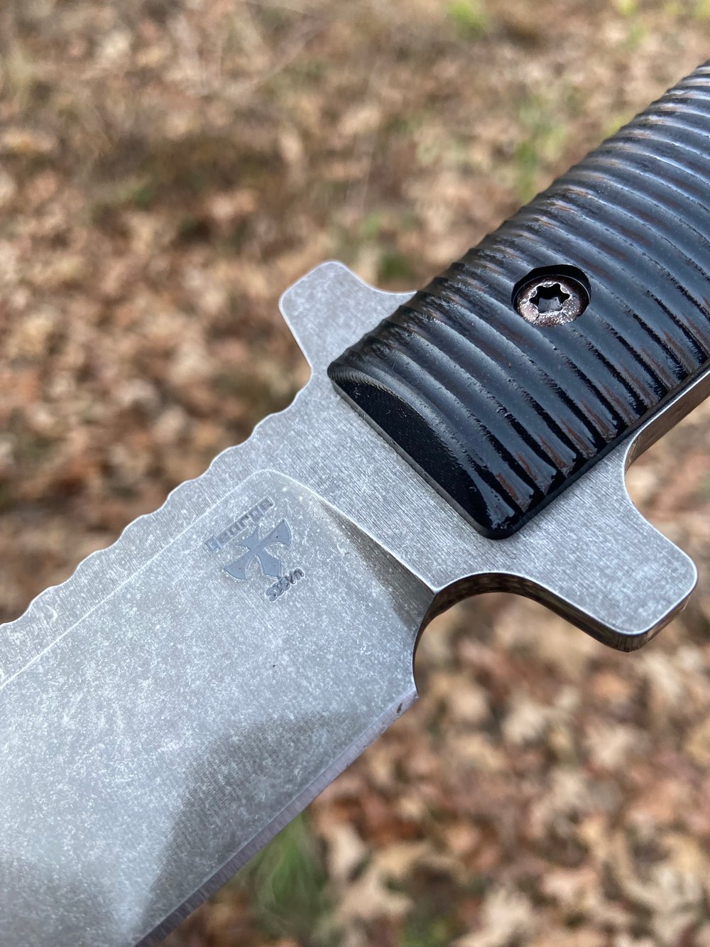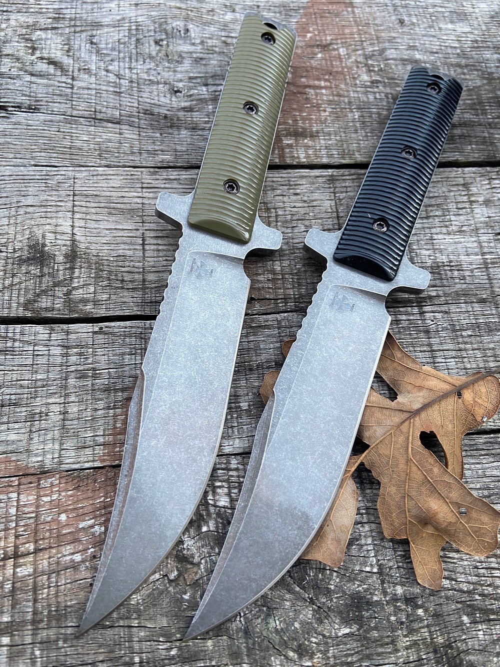 Based on the M12 EOD knife, the M12 Bowie is a full flat ground cutting machine. Hollow machined false edge and flat ground main bevel. I retired my personal M12 for the Bowie version. The M12 is stout, over a quarter inch thick tool that made to stand up to probing, prying, cutting and even hammering. The handle has textured machined G-10 scales. Proven in the field, this knife is also perfect for a bailout bag in the trunk or truck.